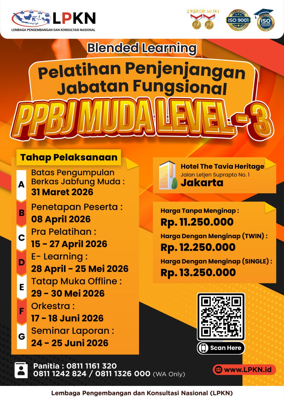 Dalam rangka peningkatan SDM dan Pembinaan Jabatan Fungsional Pengelola Pengadaan, LPKN sebagai LPP Terakreditasi A LKPP akan menyelenggarakan Pelatihan Penjenjangan Jabatan Fungsional Pengelola Pengadaan Barang Jasa (JFPPBJ) Muda, Pelatihan Penjenjangan JFPPBJ Muda ini akan diselenggarakan dengan model pembelajaran blended learning (pembelajaran mandiri dan pembelajaran tatap muka secara daring) serta On the Job Training (OJT), dengan ketentuan sebagai berikut: