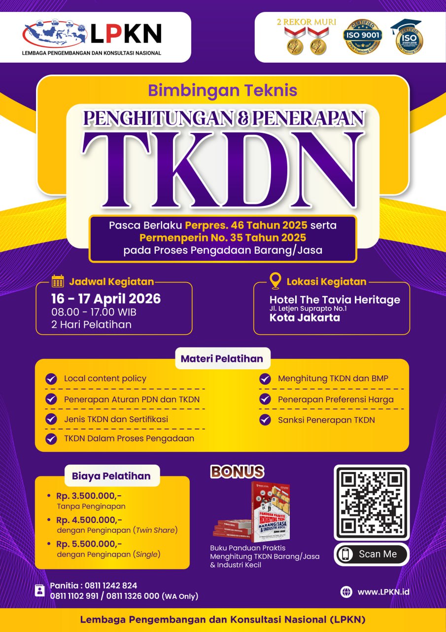 Lembaga Pengembangan dan Konsultasi Nasional (LPKN), adalah lembaga Pendidikan dan Pelatihan, dan telah berkiprah sejak 2005, saat ini LPKN telah tersertifikasi ISO manajemen mutu ISO 90001 2015 serta ISO Pendidikan 21001 2018, tahun 2020 dan 2021 juga mendapatkan 2 rekor MURI, sebagai penyelenggaran pelatihan terbanyak se Indonesia. LPKN telah Terakreditasi A Oleh Lembaga Kebijakan Pengadaan Barang/ Jasa Pemerintah (LKPP) – RI dan telah dipercaya oleh puluhan ribu Instansi Pemerintah serta BUMN, dan juga telah menghasilkan alumni lebih dari 3.000.000 orang, yang tersebar di seluruh Indonesia, berbagai materi Pelatihan termasuk Pelatihan Kompetensi dari BNSP, Kemenaker, LKPP, dan berbagai pelatihan kompetensi lainnya. Dengan komitmen yang kuat, menjadikan LPKN sebagai Lembaga Pendidikan terpercaya dan terus berupaya menghasilkan alumni yang berkualitas dan kompeten, serta mengkedepankan kualitas pelayanan dalam setiap penyelenggaraan pelatihan.